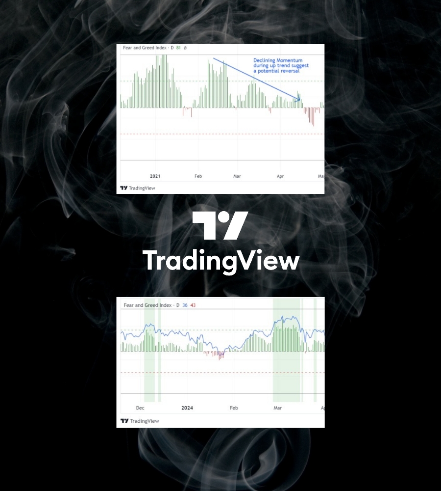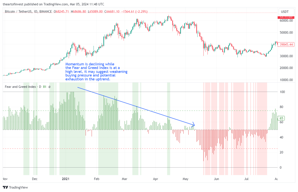 在上升趋势中:如果动量开始下降,而恐惧与贪婪指数处于高位,可能表明买入动力减弱,上升趋势即将结束。